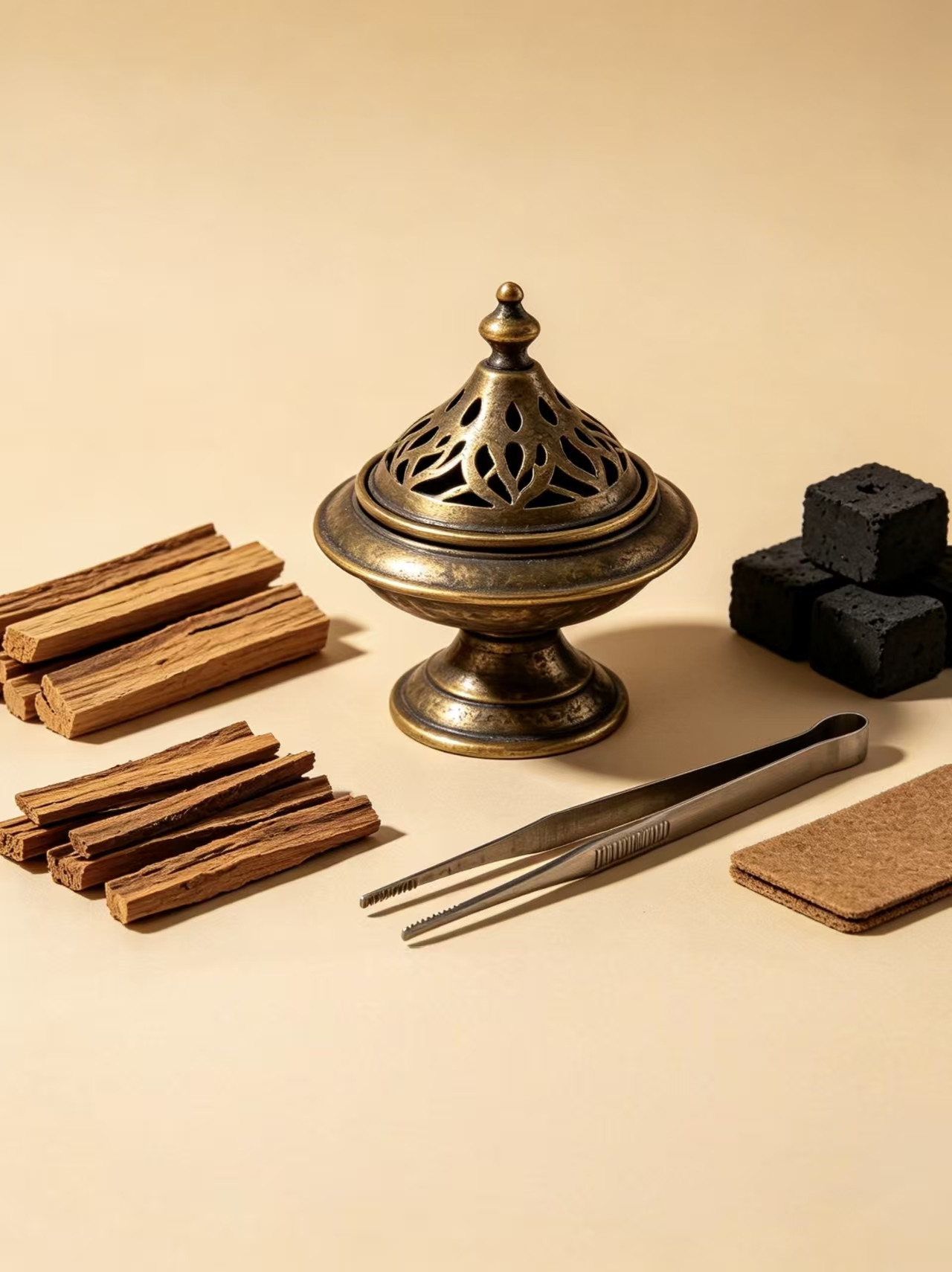 Premium Arabian bakhoor ritual set with handcrafted mabkhara burner, high-grade oud bakhoor chips, and complete tools for authentic traditional incense ceremonies.